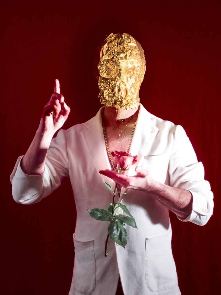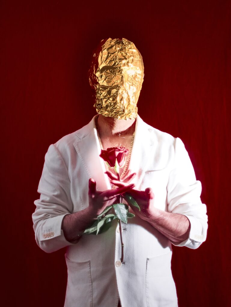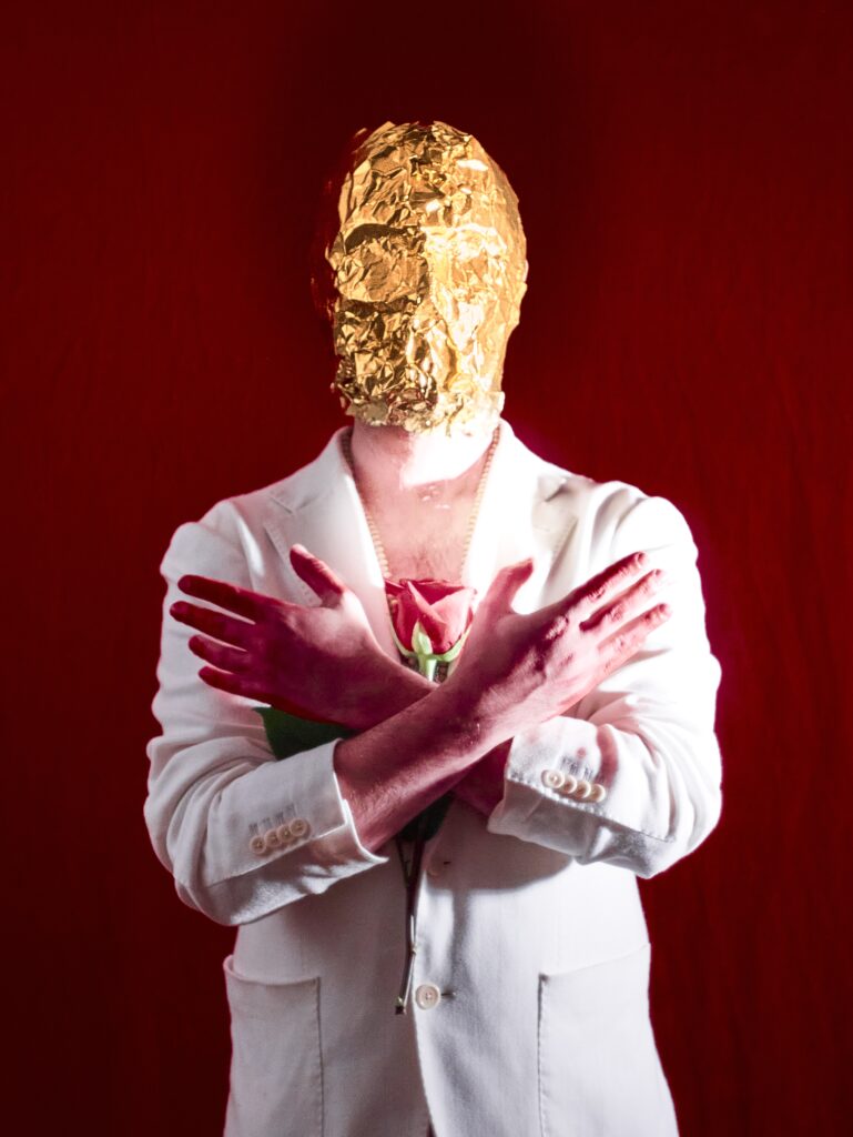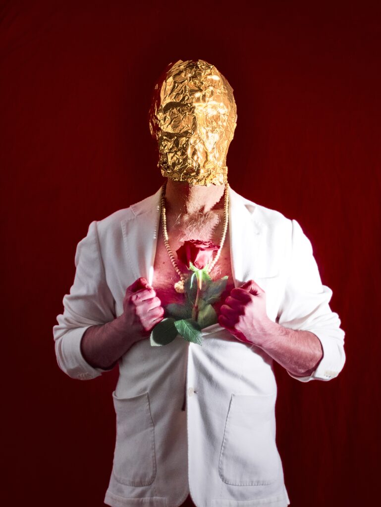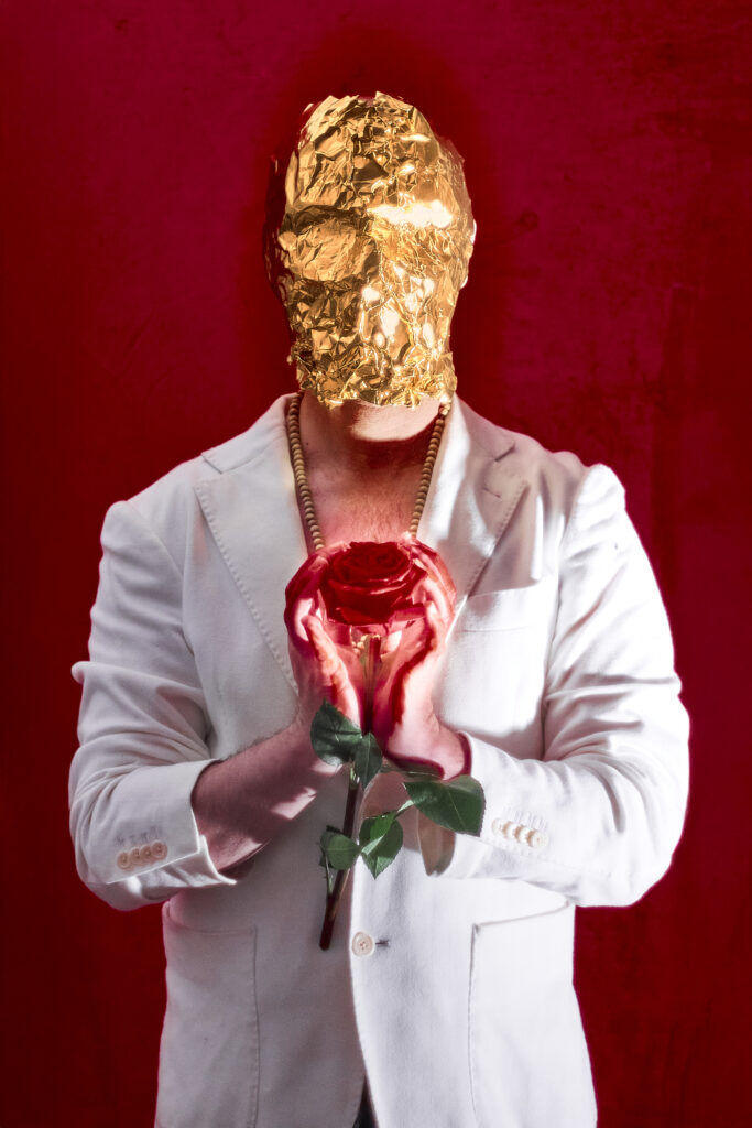 Con il progetto fotografico “L’ Artista muore nell’Arte” il performer mette inscena il corpo come icona sacrificale. Le pose che s’inspirano simultaneamente a Santi cristiani e Divinità’ induiste, un lessico di gesti e ferite, una rosa rossa come sego di ardore e offerta, connotano il simbolismo all’interno della filosofia esistenzialista, problematizzando il rapporto con l’Essere. L’indagine dell’Essere, all’interno della poetica del performer, e’ la ricerca stessa dell’Arte, di Se’ e dell’ io nell’arte. Sotto questa luce la maschera d’oro di tradizione funeraria arcaica (si pensi alla maschera di Agamennone e alla maschera dei faraoni egizi), cosi’ come il titolo dato all’opera, assume un duplice significato. Da un lato e’ la morte dell’io dell’artista nella ricerca dell’Arte e della sua rinascita nella luce sacra della stessa, come veicolo sacro di connessione con gli strati più’ profondi dell’Essere. L’immagine diventa altare e laboratorio: il corpo e’ materia che si espone alla luce per rivelarne i limiti, ma anche soglia in cui l’assenza e la presenza dialogano. Senza compiacersi dell’estetica del martirio, l’artista interroga il desiderio di trascendenza e la necessita’ di incarnazione, come se ogni fotografia fosse un atto devoto e, insieme un esperimento di consapevolezza che interroga con l’arte l’Essere. La sua ricerca richiama forze invisibili che tengono insieme lo sguardo: non e’ ciò’ che appare, ma ciò che grava nel profondo; una gravita’ segreta che rende leggibile il dolore, lo converte in segno e restituisce al corpo il compito antico di farsi immagine, reliquia, memoria, rituale e veicolo di conoscenza spirituale. Il rosso della rosa e delle mani e’ la passione (pathos), che l’opera richiede nell’essere creata e che scaturisce dal cuore, sede luminosa dell’identità’. L’Artista crea con il cuore e con il cuore problematizza il rapporto con l’Essere attraverso l’Arte.